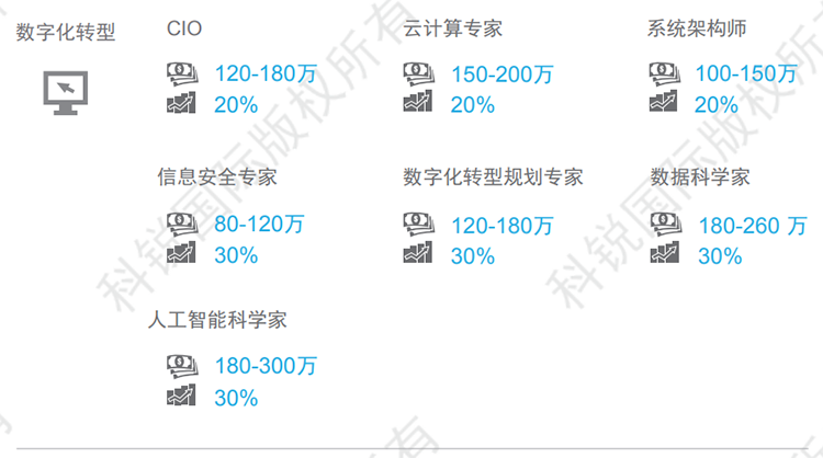 中国数字化转型正处于全面加速期。2020年4月20日,国家发改委提出以5G、人工智能、工业互联网、物联网为代表的新型基础设施,本质上是信息数字化的基础设施,与新基建核心技术直接相关的行业人才招聘需求猛增,聚焦在数字化服务、区块链、人工智能、数据服务、物联网、信息安全几个领域。本文带来2021美狮贵宾会薪酬报告对数字化转型领域的人才招聘趋势分析。