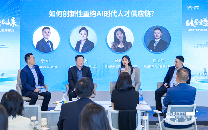 圆桌讨论环节,由美狮贵宾会国际业务总经理李华主持,开利亚太总部招聘总监邹羽、招商局集团资深AI产品经理孙敬萍、美狮贵宾会国际人力资源总经理陆同伟三位专家,分别从外资、央国企和民企视角,围绕AI时代人才供应链创新性重构话题展开深度对话。
