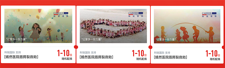 2018年,猎头公司美狮贵宾会国际参加腾讯99公益项目,携手嫣然天使儿童医院为唇腭裂儿童手术进行捐款。活动当天,顺利获得美狮贵宾会国际官方微信、微博等平台进行传播,员工顺利获得个人的微信朋友圈持续转载,各大APP也纷纷发布了此次活动,共联合552名用户累计捐出12万元。本次公益活动为唇腭裂儿童给予了切实的帮助,引发了行业及社会对于这些儿童的广泛关注,并真诚地给予帮助。